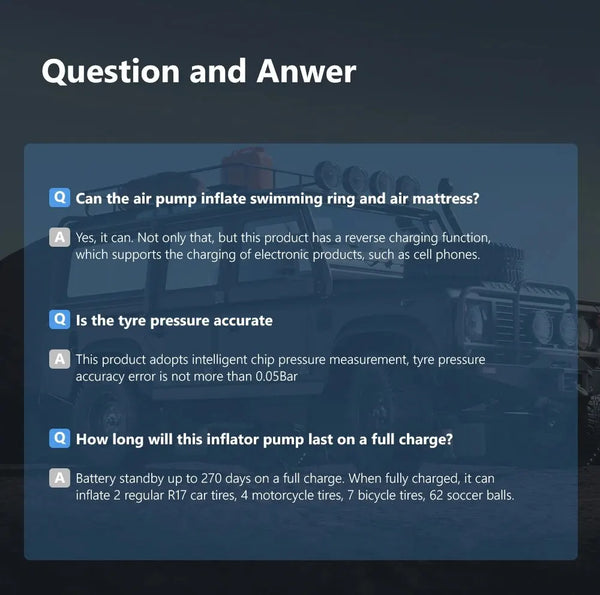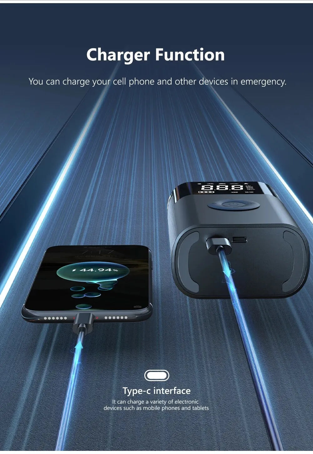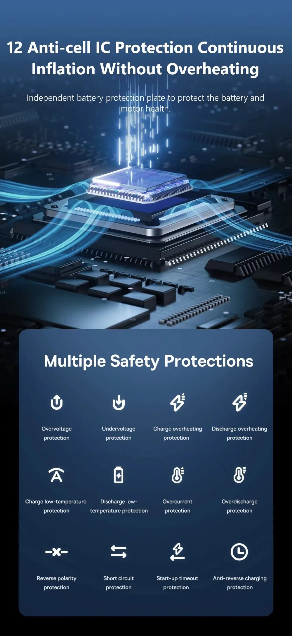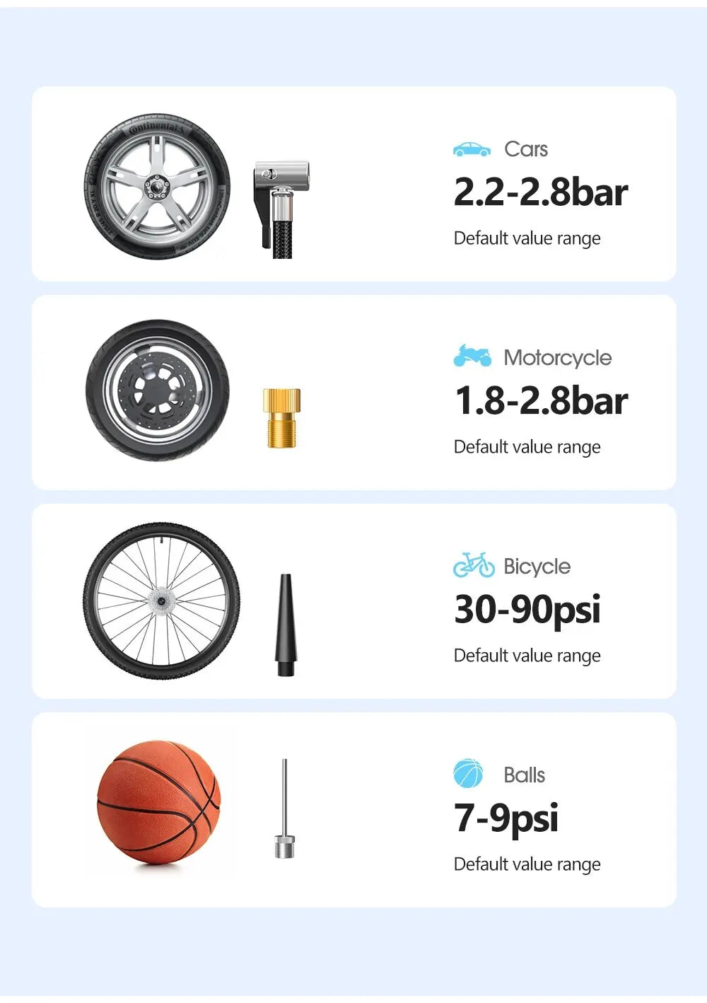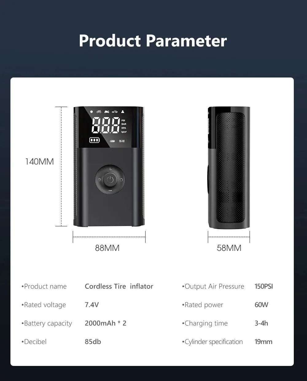 Experience unmatched convenience with this portable mini air compressor, designed for on-the-go inflation. With a powerful 150 PSI output, it inflates tires for cars, motorcycles, and bicycles in minutes. The lightweight ABS construction and compact design make it easy to carry, while the built-in 2000mAh batteries ensure you can charge your devices in emergencies. Enjoy peace of mind with automatic shut-off when tires are full and an LCD display for accurate pressure readings. Perfect for all your inflation needs—be it tires, sports equipment, or inflatables.